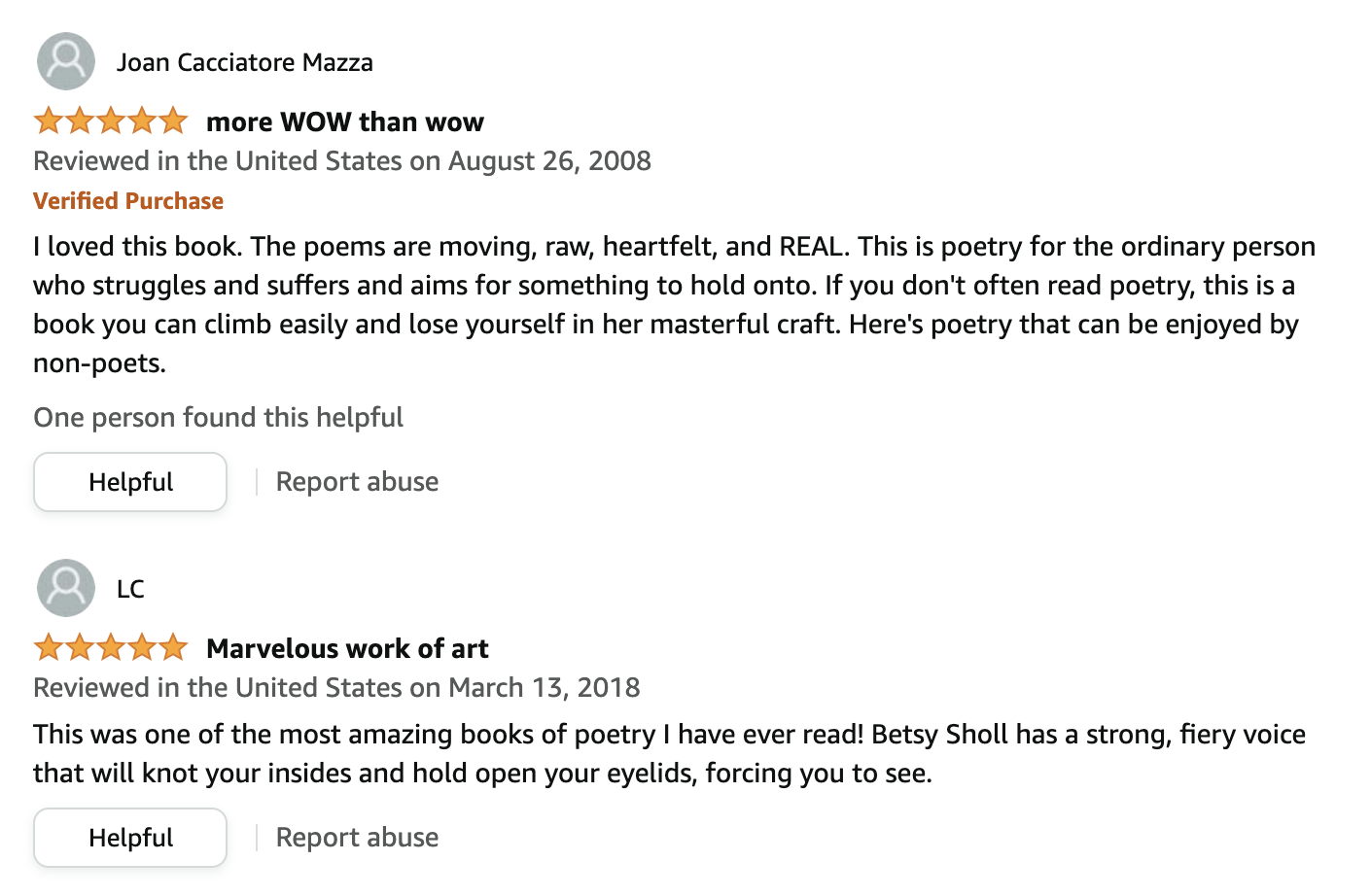“I love Sholl’s unyielding honesty, the great heart and deep intelligence of her vision.”―Nancy Eimers