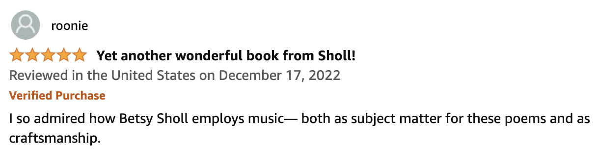 “Attuned as she is to harmony—musical, spiritual, earthly—Sholl weaves seemingly miscellaneous notes into vibrant wholes. She references Dante more than once and it’s apt, for she is very much a pilgrim, someone who conveys the feeling of being in it—the tangle that is a moment, a street scene, a biblical incident—and that is a key to her achievement, her openness to the ways of being. Great compassion marks these poems, that inestimable talent for tracing the ways of kinship, how one occasion graces another.”—Baron Wormser